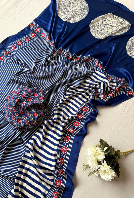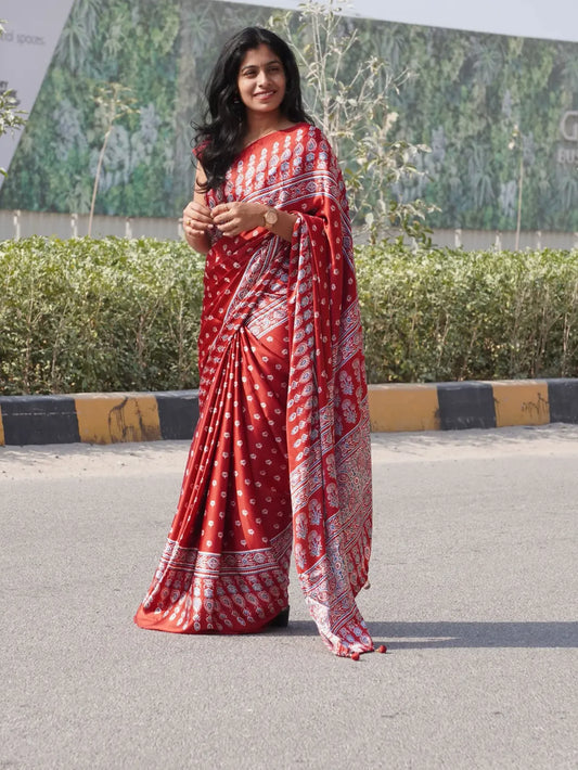 Elevate your wardrobe with the Akruti Modal Silk Ajrakh Natural Printed Saree. Crafted from luxurious...