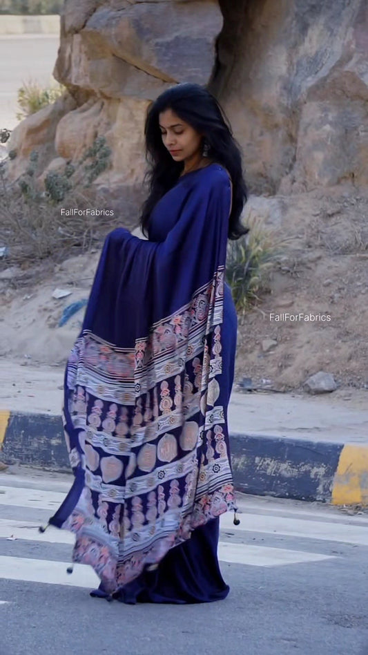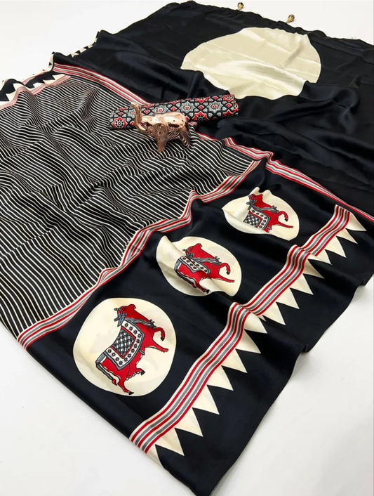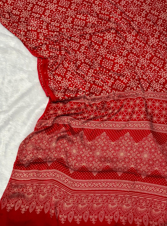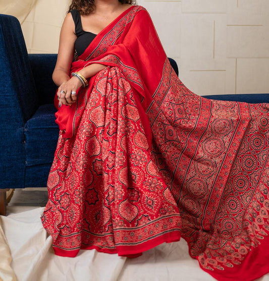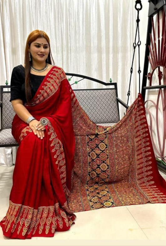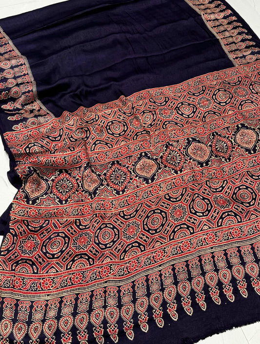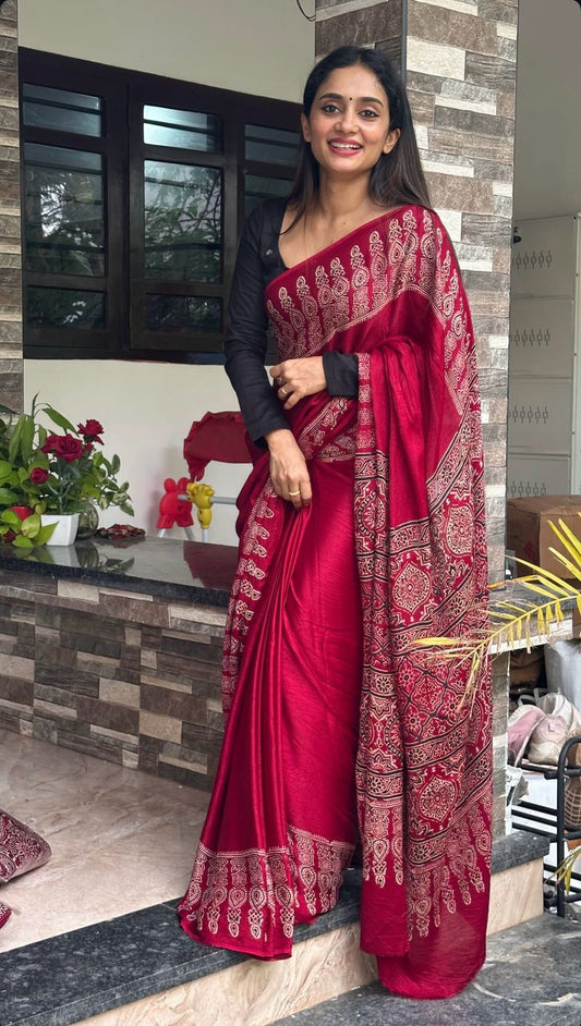 Ajrakh Print Premium Silk fabric Saree With very soft in texture.. Light weight Silk Fabric...