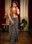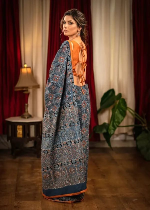 Ajrakh Digital Print Border with Ajrakh Rich Pallu With Contrast Blouse