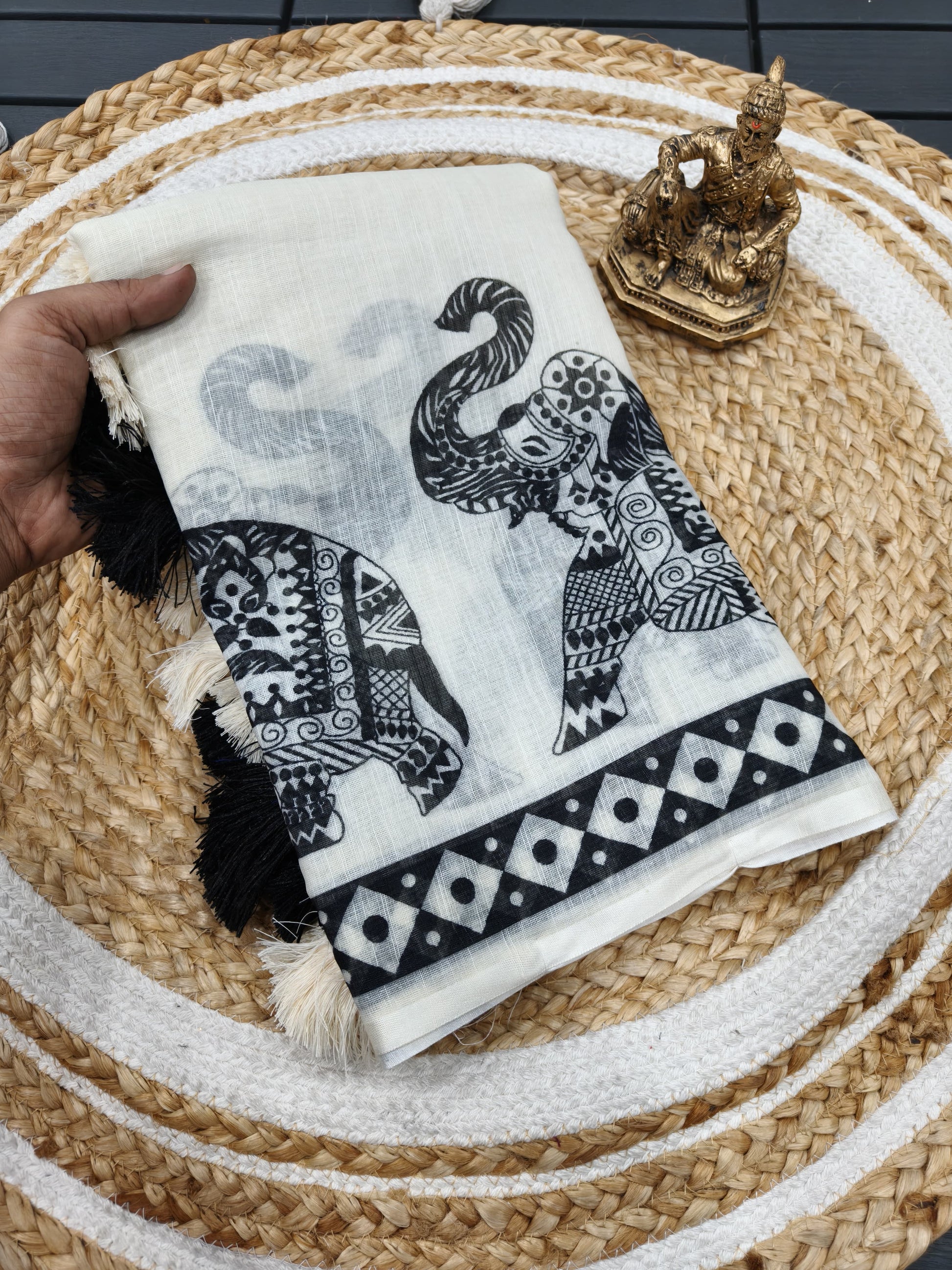 Pure White Elephant Design Cotton Linen Saree